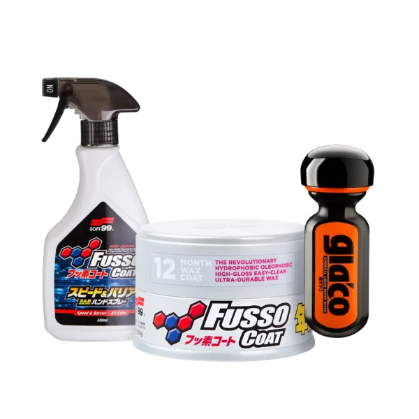 Šiame 3 dalių rinkinyje yra gerbėjų mėgstamas „Fusso Coat 12 Months Dark“ vaškas, ištisus metus veikianti stiklo danga „Ultra Glaco“ ir su „Fusso“ suderinamas „Fusso Coat Speed & Barrier“ quick detailer’ris.
