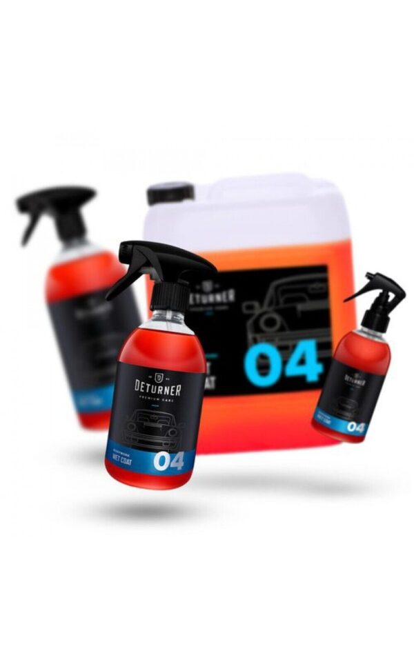 Deturner Wet coat greito hidrofobinio poveikio danga, purškiama ant švaraus ir šlapio paviršiaus, siekiant apsaugoti ir pagerinti blizgesį. Padidina dangų, vaškų hidrofobines savybes arba veikia kaip nepriklausoma apsauga. Paviršius tampa slidus, todėl sausinimas tampa malonesnis ir greitesnis. Galite lengvai apsaugoti ratlankius, dažus ir plastiką. Tai geras pasirinkimas žmonėms, kurie neturi laiko vaškuoti, ir profesionalams, kurie nori per trumpą laiką blizginti ir pagerinti paviršiaus atsparumą vandeniui.