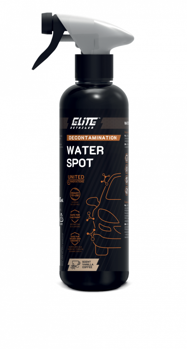 ELITE DETAILER WATER SPOT inovatyvus produktas, skirtas pašalinti kieto vandens pėdsakus ant automobilio kėbulo, malonaus kavos ir vanilės kvapo. Pašalina druskas, metalo jonus ir ant dangų susidariusias silicio dioksido nuosėdas.
