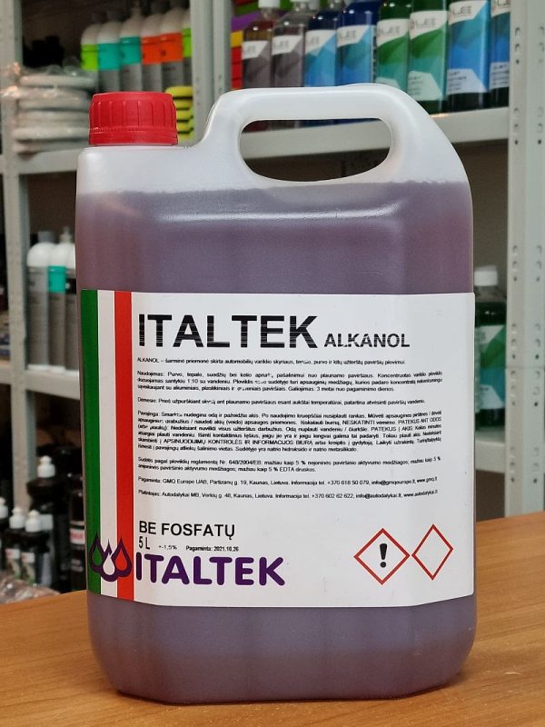 ITALTEK ALKANOL – šarminė priemonė, skirta automobilio variklio skyriaus, tepalo, purvo ir kitų užterštų paviršių plovimui. Naudojimas: koncentruotas variklio ploviklis dozuojamas santykiu 1:10 su vandeniu. Gautas tirpalas užpurškiamas ant plaunamo paviršiaus purkštuvu arba naudojant putų formavimo įrenginius. Palaukus 2-2,5 min. nuskalaujama švariu vandeniu, naudojant aukšto slėgio įrenginius. Ploviklis savo sudėtyje turi apsauginių medžiagų, kurios padaro koncentratą nekenksmingu sąveikaujant su aliuminiais, plastikiniais ir guminiais paviršiais.