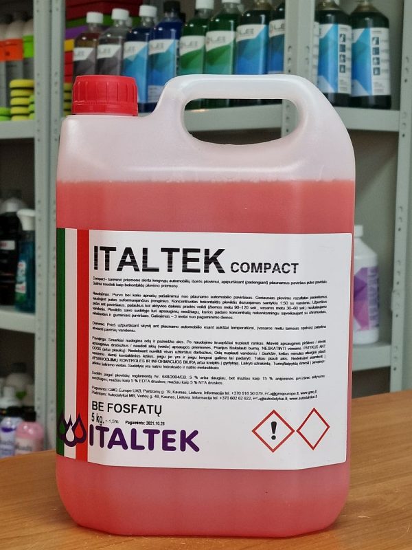 ITALTEK COMPACT – itin efektyvios aktyvios bekontakčio plovimo putos lengviesiems automobiliams. Šarminė priemonė, skirta automobilių išorės plovimui, apipurškiant (padengiant) plaunamus paviršius putų pavidalu. Geriausias rezultatas pasiekiamas naudojant putas suformuojančius įrenginius. Koncentruotas bekontaktis ploviklis dozuojamas santykiu 1:50 su vandeniu. Užpurškus putas ant paviršiaus, palaukus kol aktyvios dalelės pradės veikti (žiemos metu 90-120 sek., vasaros metu 30-60 sek.) nuskalaujama vandeniu. Ploviklis savo sudėtyje turi apsauginių medžiagų, kurios padaro koncentratą nekenksmingu sąveikaujant su chromuotais, nikeliuotais ir guminiais paviršiais.