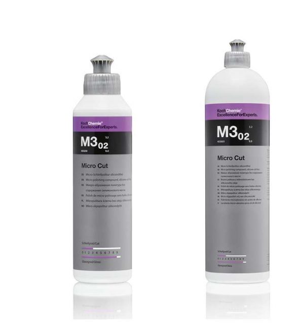 Koch Chemie Micro Cut M3.02 užbaigiamoji pasta, tai labai švelni pasta, turinti itin geras valomasias savybes. Koch Chemie gaminamos vienodo dydžio abrazyvinės dalelės leidžia sukurti itin blizgančio paviršiaus efektą net ant tamsių ar juodų paviršių. Priemonė sukuria šį efektą mechaniškai veikdama paviršių, o ne uždengdama permatomu sluoksniu kuris ilgainiui nusiplauna. Rekomenduojama dirbti su minkštais padais, tokiais kaip Koch Chemie Micro Cut poliravimo kempinė.