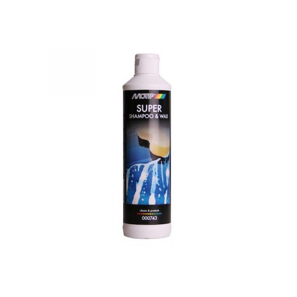 MOTIP SUPER SHAMPOO & WAX – šampūnas su vašku, skirtas automobilių išorei plauti ir apsaugoti. Puikios valymo savybės, suteikia blizgesį, apsaugo nuo atmosferos poveikio, sumažina purvo prikibimą. Sudėtyje nėra tirpiklių. Labai koncentruotas.