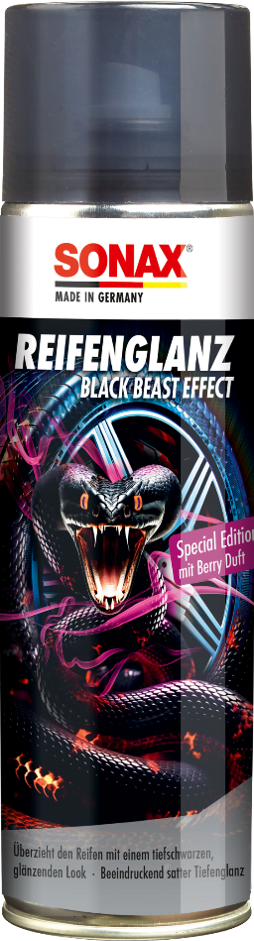 Vaisių ir uogų kvapo padangų juodintojas.Suteikia sodriai juodą spalvą ir blizgesį.Reguliariai naudojant, apsaugo padangas nuo įtrūkimų, priešlaikinio senėjimo ir išblukimo.Tinka visų tipų padangoms.Lengvas naudojimas: suplakite, užpurkškite ir leiskite įsigerti.Malonaus kvapo.Prieš juodinant padangas rekomenduojame jas nuplauti, išvalyti su SONAX padangų valikliu